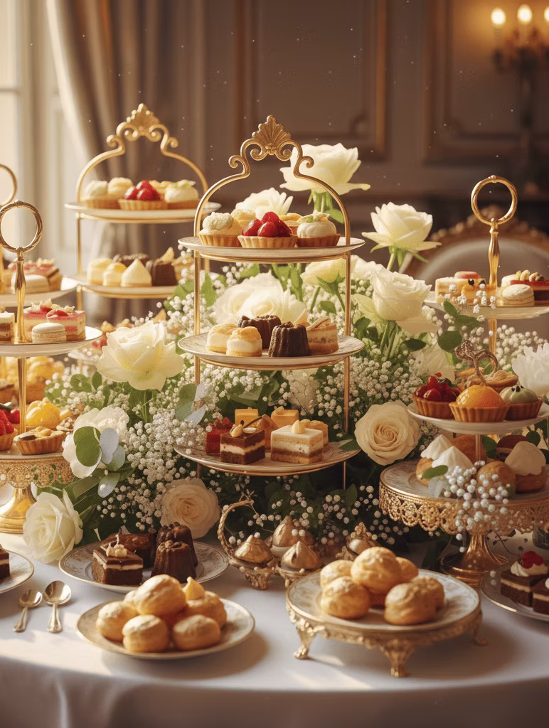 外燴王的茶會點心外燴方案,以歐式黃金風格食器擺放出高低層次,交錯堆疊中又富有協調的美感,配上精緻花藝佈置與高級綢緞桌巾,呈現出後現代美學的精髓。